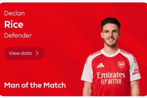 體育資訊12月28日訊 阿森納在本輪英超2-1擊敗布萊頓,賴斯當選全場最佳。