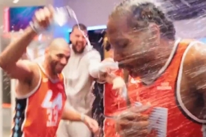 賽后,快船更衣室瘋狂潑水慶祝,萊昂納德渾身被澆透。
