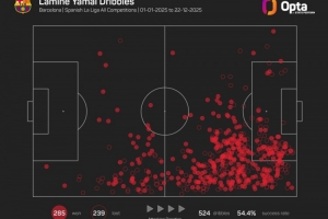 18歲的巴薩右邊鋒亞馬爾在今年各項(xiàng)賽事共計524次嘗試過人,285次成功過人是為五大聯(lián)賽球員同期最多。