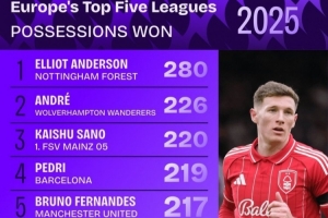 體育資訊12月31日訊 2025年即將結(jié)束,數(shù)據(jù)機(jī)構(gòu)squawka也統(tǒng)計(jì)了本年度五大聯(lián)賽奪回球權(quán)情況,諾丁漢森林中場(chǎng)埃利奧特·安德森獨(dú)自領(lǐng)跑。