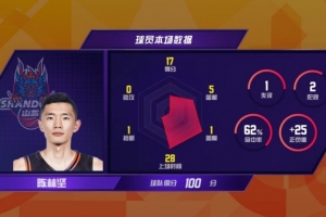 陳林堅(jiān)本賽季出戰(zhàn)8場(chǎng)比賽,場(chǎng)均貢獻(xiàn)12分,是山東隊(duì)內(nèi)得分最多的國(guó)內(nèi)球員。球隊(duì)主帥邱彪指導(dǎo)在談及陳林堅(jiān)的加盟時(shí),他表示:“引入陳林堅(jiān)對(duì)我們非常重要,他是非常優(yōu)秀的投手,為球隊(duì)增加了很多可塑性?!鼻癖脒€透露,在休賽期備戰(zhàn)中,陳林堅(jiān)在對(duì)抗訓(xùn)練中的投籃命中率始終保持在60%以上。
