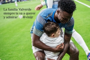 維尼修斯遭到皇馬球迷的噓聲對(duì)待,皇馬中場(chǎng)巴爾韋德社媒曬出兒子與維尼修斯擁抱的照片,力挺隊(duì)友:“我們一家永遠(yuǎn)愛(ài)你敬你。”