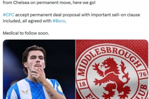 報(bào)道稱切爾西接受了包含重要二次轉(zhuǎn)會(huì)分成條款的永久轉(zhuǎn)會(huì)提議,所有細(xì)節(jié)已與米德爾斯堡達(dá)成一致。球員的體檢將在近期進(jìn)行。